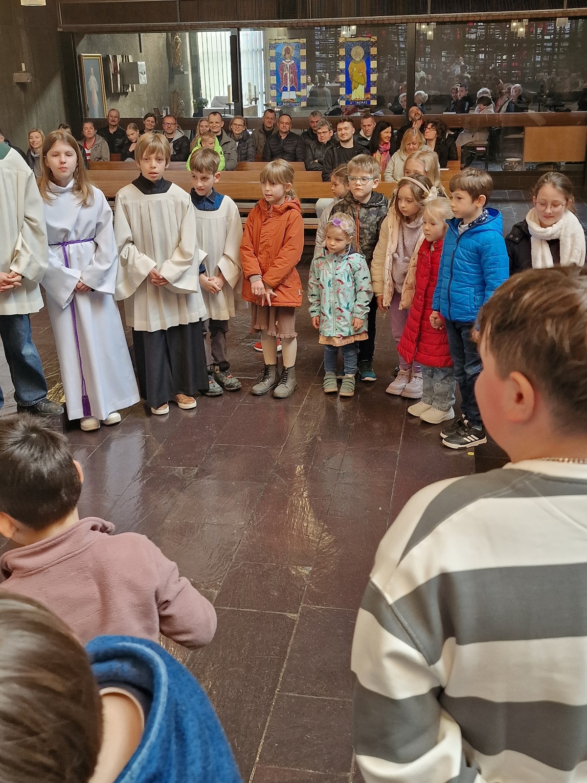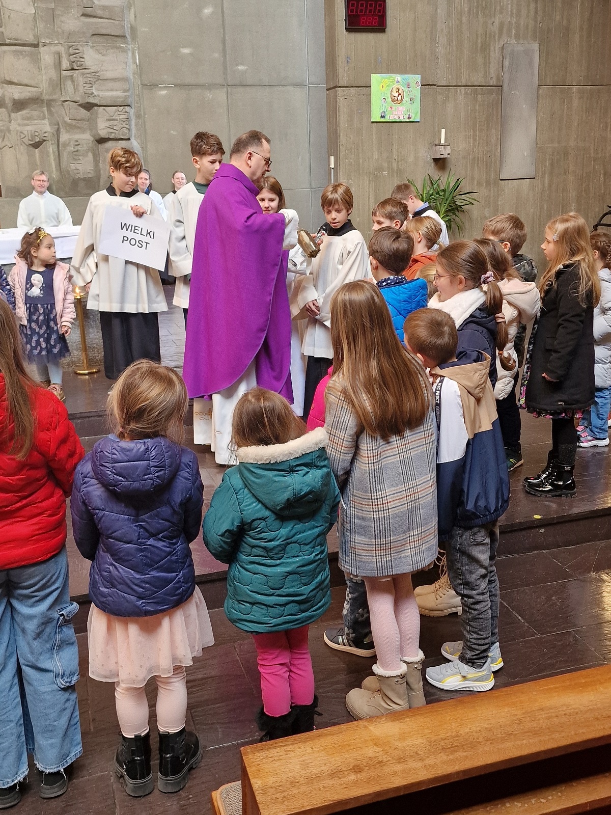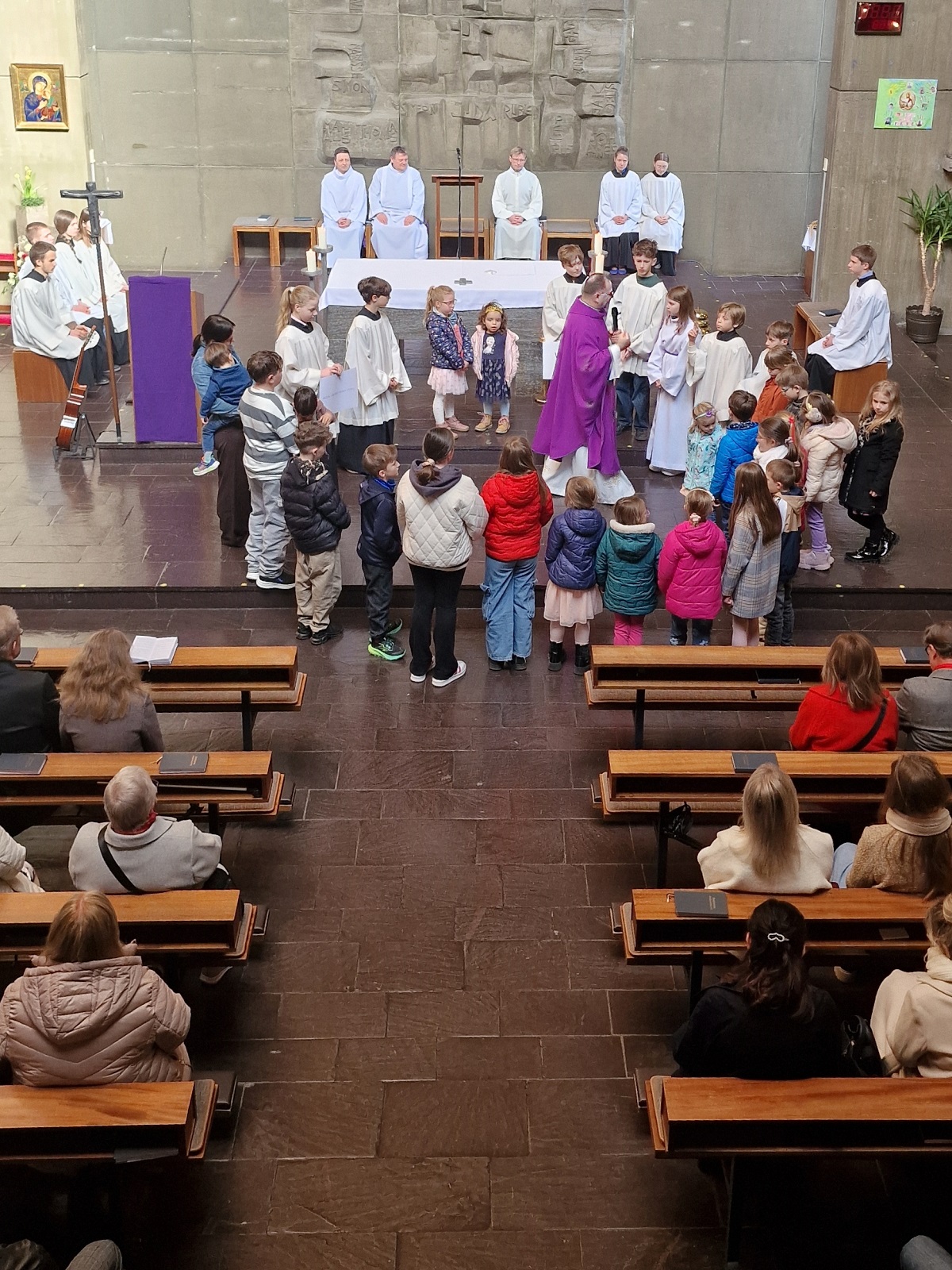 Podczas kazania dzieci zostały zaproszone na chwilę bliżej ołtarza, gdzie w formie krótkiej rozmowy ojciec proboszcz wyjaśniał im w prosty sposób treść Ewangelii oraz nawiązał do przeżywanego w Kościele okresu Wielkiego Postu. Po zakończeniu homilii dzieci wróciły na swoje miejsca w ławkach.